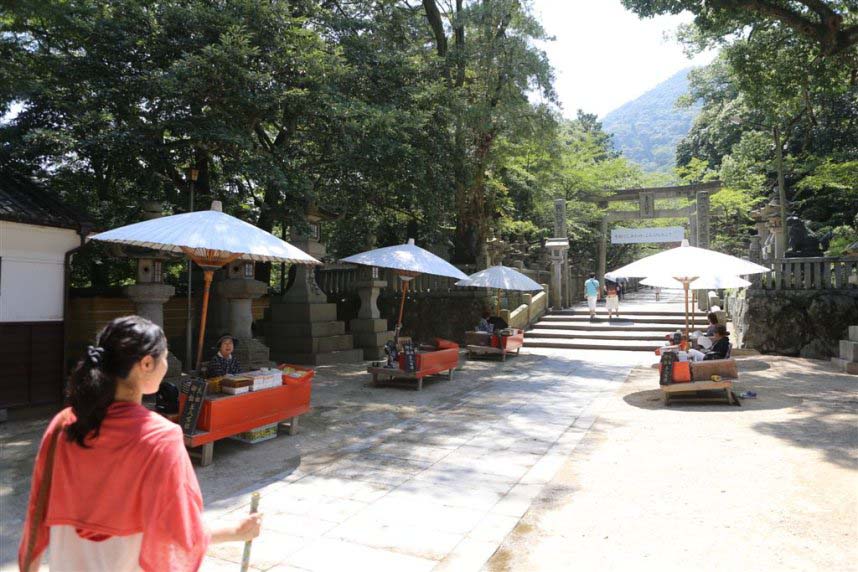 大門をくぐると、白い大きな傘をさして飴を売る5軒の店があります。先祖代々、境内の神域で商いをすることを許された「五人百姓」で、販売している「加美代飴」は古くから参拝客に親しまれているこんぴら名物の一つ。黄金色に輝く扇型の飴は、付属の小槌で割っていただきます。歩き疲れた身体に、自然の甘みが嬉しい!