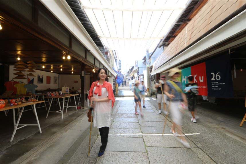 参道の両脇には、たくさんの土産物店やうどん店などが立ち並び、御本宮までの全785段のプロローグが賑やかに始まります。ただし、ここで買い物をしてしまうと荷物になるので、お帰りの際に購入するのがベター。石段の113段目には、「一之坂鳥居」が現われてきます。