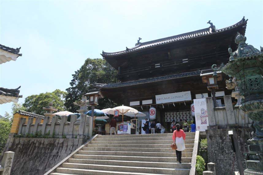 古くから「こんぴらさん」として親しまれている海の神様です。参道の長い石段は有名で、参道口から御本宮まで785段、奥社までは、1,368段にも及びます。参道から奥社までの石段沿いには大門、五人百姓、国の重要文化財「書院」。広い境内には国の重要文化財「旭社」など由緒ある建造物が点在するほか、宝物館などには第一級の美術品や文化財が陳列されています。参道の両脇には土産物やうどんの店などが並び、周辺には、旧金毘羅大芝居(金丸座)や高灯籠など見どころも数多くあります。