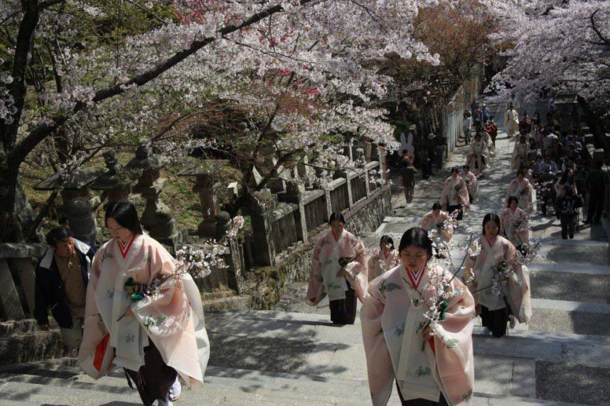 大門から150mほど続く石畳の道は、両側に無数の石灯籠が並び、数十株の桜が植えられた「桜馬場」と呼ばれる桜の名所です。毎年4月10日には「桜花祭」が行われ、ここから御本宮まで桜の枝を持った巫女と、冠に桜の枝を挿した神職による優美な行列を見ることができます。