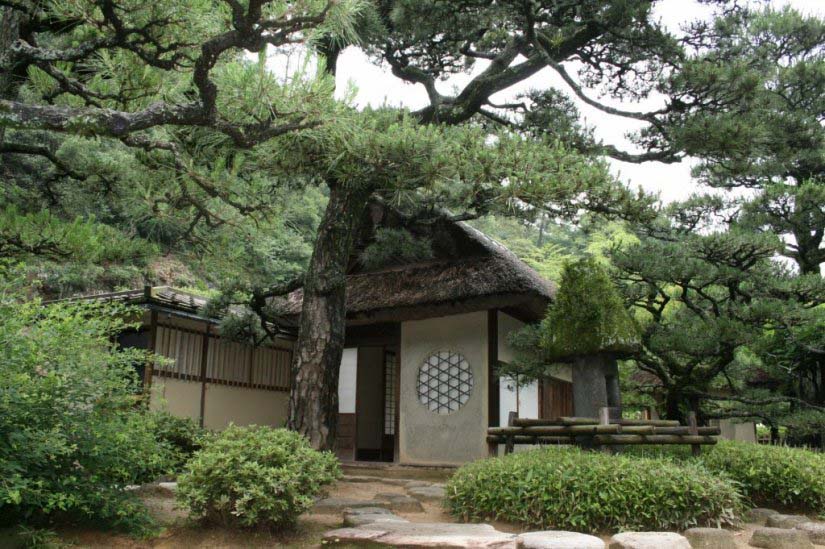 1700年前後に建てられた江戸時代初期の大名茶室の様式を今に伝える建物で、茶道・三千家の1つ武者小路千家が誕生した頃の造りともいわれています。高松藩と武者小路千家の関わりは深く、初代藩主・松平頼重(よりしげ)が後に武者小路千家を興した初代千宗守(一翁)を高松藩初代茶道頭として招いたのをきっかけに、歴代の家元が高松藩の茶道指南を務めました。