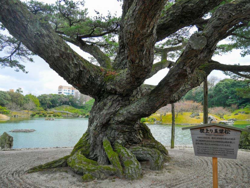 高さ約8m、幹の周りの太さは約3.5mにもなる松の巨木。天保4(1833)年に高松藩9代目の松平頼恕(よりひろ)が、徳川11代将軍の家斉(いえなり)からいただいた鉢植えの盆栽を庭に植えたところ大きく成長したものと伝えられています。松が多い栗林公園でも五葉松はこの1本だけです。