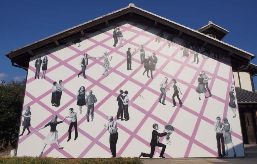 『恋のダンスパーティー』と称された壁画は、高さ7.5m、幅9.3mで、映画の一場面を切り取ったかのように壮大に描かれており、昭和ノスタルジックな町並みの中で一際目立ちます。 制作は小豆島町の坂手港待合所に「小豆島縁起絵巻」を手掛けた岡村美紀氏。作品は、紳士からのプロポーズを受け取れるシーンや老紳士と一緒にダンスを踊ることができるシーンなど、「インスタ映え」するスポットとしても楽しめます。