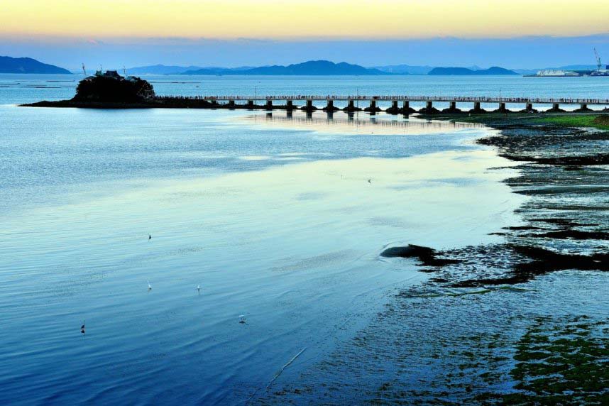 三豊市の沖に浮かぶ小さな島に奉られた津嶋神社。子どもの守り神として古くから親しまれている神社です。瀬戸内海の多島美を背景に、他にはない特別な情景を作り出しています。海岸から島までは長い渡り橋が架けられておりますが、普段は渡ることができませんが、毎年8/4・5に行われる夏季大祭の時のみ渡ることができ、県内外から多くの参拝客が訪れます。
