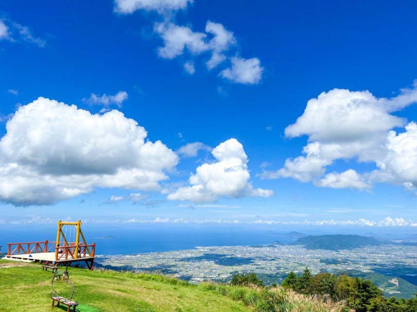 四国八十八箇所霊場第66番札所・雲辺寺がある雲辺寺山。標高920mにある雲辺寺山頂公園からは、三豊平野や燧灘(ひうちなだ)が一望できます。雲辺寺山頂公園内には様々なフォトスポットがありますが、一番人気は「天空のブランコ」。公園の端っこに立っているため、乗って漕ぐと空へ飛び出して行くような感覚が味わえます。