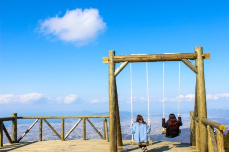 雲辺寺に隣接する雲辺寺山頂公園には「インスタ映え」する写真が撮れるスポットとして注目を集めている「天空のブランコ」「天空のフォトフレーム」があります。ブランコは標高約920mの山頂公園のなだらかに下る斜面の上に立てられているため、乗って漕ぐと空へ飛び出して行くような感覚が味わえ、スリル満点!フォトフレームごしに絶景を収めたフォトジェニックな写真を撮影することもできます。