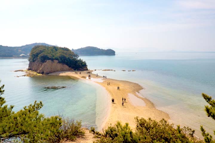 弁天島から中余島、小余島を介して大余島まで、1日2回、引き潮のときにだけ現れる砂の道。このとき大切な人と手をつないで渡ると、天使が舞い降りて願いが叶うという。隣接する約束の丘展望台からは、エンジェルロードが見渡せる。